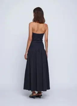 An understated silhouette that celebrates figure and form. This strapless multi media dress is cut in a finely woven cotton poplin, contrasted with a ribbed jersey offering sleek comfort. The design details a bandeau neckline and a drop waist maxi skirt, neatly gathered to add volume. Style for any occasion with the right accessories.