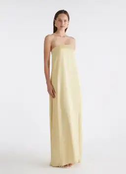 The Delfina Dress in Champagne is a timeless occasion piece to keep in your wardrobe for years to come. Showcasing a feminine strapless silhouette and internal bodice for support and ease of wear. Cut in a soft silky feel fabrication and completed with side pockets. This dress can be styled for summer day time events or more formal evening events.