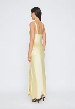 A nod to the best of 90s red carpet dressing, grounded in a timeless column silhouette. This bias cut slip dress offers subtle dimension and fluid drape. Designed with a minimal round neckline, a side split skirt, and finished with gathering cinched at the side.
