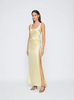 A nod to the best of 90s red carpet dressing, grounded in a timeless column silhouette. This bias cut slip dress offers subtle dimension and fluid drape. Designed with a minimal round neckline, a side split skirt, and finished with gathering cinched at the side.