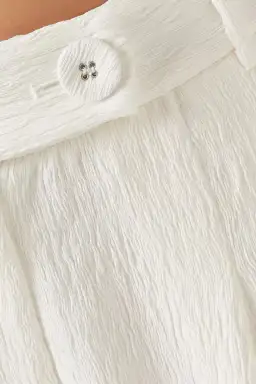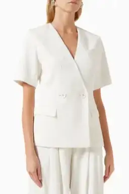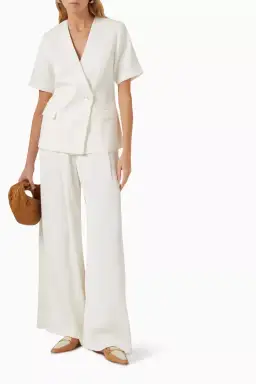The Kathleen Jacket is collarless, features a double breasted closure and short sleeves. Paired back with the Matteo Pants that feature a front zip and button closure, and pleated waistline for a flattering finish.