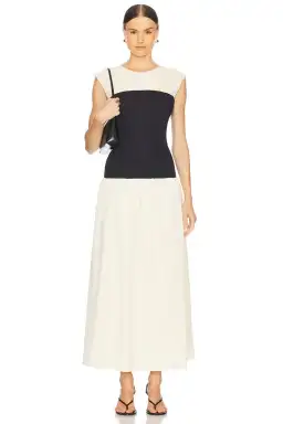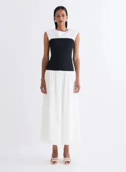 Crafted from a finely woven cotton poplin, the Stefania Dress is the perfect day-to-night dress, offering sleek comfort. Featuring a contrast ribbed jersey bodice, a ruched top and skirt and a drop waistline for volume and movement.