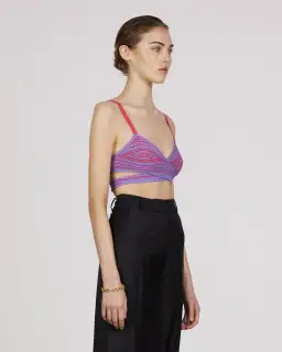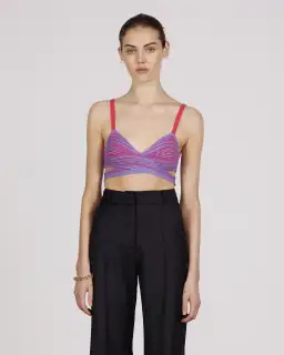 Sleeveless crop top made from an engineered two-tone rib-knit, with wrap front and cut-out sides. The Viki Bra Top features a bold knitted pattern and cross-over effect.
