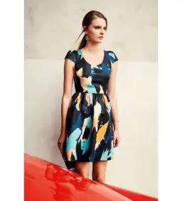 Exposed back zipper, rounded neckline, cap sleeves, has pockets.