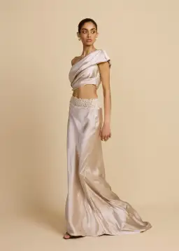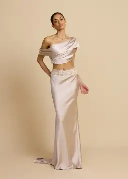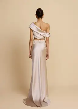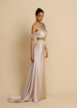Introducing the Anaya set, featuring an asymmetrical off-shoulder neckline with effortless draping, she gracefully compliments the décolletage. Paired with a floor-length bias cut silhouette skirt made in an iridescent oyster hue. Featuring a vintage-inspired lace trim and an exaggerated draped back train, she is a seamless balance of elegance and vintage charm.