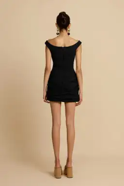 Avery is an elevated black mini crafted from a sculpting crepe. She features an effortless off-shoulder neckline that compliments the décolletage, finished with draped tucks at the hips to flatter and accentuate the feminine form. Elevated in finish, Avery is go-to timeless LBD.