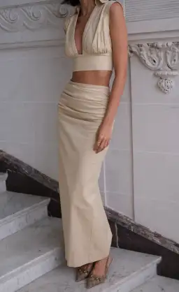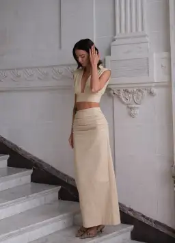 The Carmen skirt, a transeasonal skirt designed for versatility. Crafted from a luxe cotton drill in an earthy Stone hue for style and ease. Hand tacked ruching at the hipline beautifully accentuates the feminine form. Made to sit mid-waist with the option to size up for a more relaxed fit. A classic centre back split allows for movement, and a touch of sophistication. Complete with our Carmen crop for a timeless and classic set.