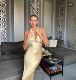 Beautiful Arcina Ori Daniella Gold in size XS (6) perfect for formals and evening wear. Halter style with a beautiful open back. Doubled-lined bodice and decollete finish. Made from a luxurious satin that catches light when you walk and hugs at the hips. **Missing the string to tie around waist area - if XS will not be any trouble