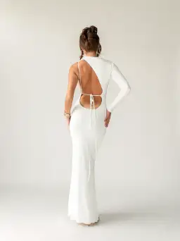 Meet Estelle, the perfect dress to take you from city date night to resort tapas. Double-lined for thickness, this body-skimming number will be sure to turn heads. Designed with an a-symmetrical look, she scoops into a sensual low back secured with satin bias ties. Finished with a slight mermaid flare and waved hem, pair her with your favourite statement earrings for a dream look.