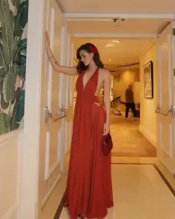 The Florence Dress features delicate hand-stitched detailing across the bust, a plunging neckline, and a flattering ruched waist designed to accentuate your figure. Its flowing silhouette is balanced with a chic open back and modern triangular cut-outs at the hips, adding a touch of sophistication and allure.