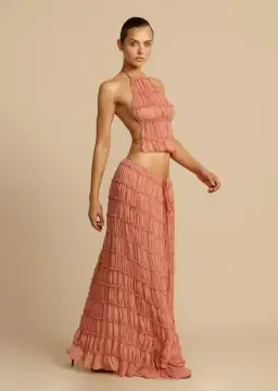 Introducing the Juliette halter, a vintage-inspired top with ruched detail and delicately piped lace. Crafted in a rich peachy hue, Juliette radiates romance and timelessness. Made for versatility, an adjustable tie secures at the neck, whilst satin elastic straps cinch the waist. Make it a set by pairing her with the Juliette skirt, or style her individually as a striking standalone piece. Elegantly sheer in finish, Juliette is designed to infuse passion and romance.