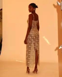 Embracing both comfort and luxury, Kendra is delicately lined with a beautiful sheer tulle. Her form-fitting ensemble flatters the feminine curves, falling gracefully just above the ankles. Complete with a centre back split and raw floral edges, Kendra stands as a luxurious statement piece, made to turn heads and catch the light.