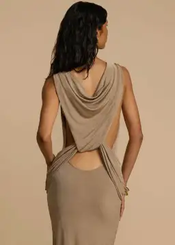 The Matisse Maxi features a classic boat neckline and a body-skimming silhouette in a metallic malt hue. A uniquely draped back adds a dramatic element, while ruched detailing at the hips creates subtle dimension. Crafted from an alluring jersey.