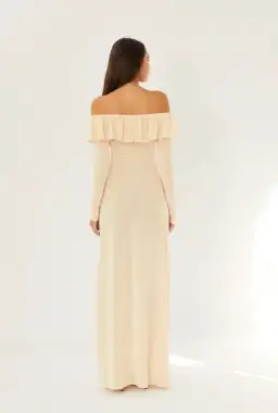 Introducing Mila, an elegant floor-length maxi that effortlessly combines understated charm and captivating allure. Made from a luxury lightweight knit in a delicate buttery cream hue, Mila embodies the essence of romance. Drawing inspiration from vintage aesthetics, she’s detailed with a flattering off-shoulder frill that gracefully drapes across the bust cascading down the centre front. Elevated with a thigh-high slit, enhancing both fluidity of movement and sensuality. Mila is the perfect transeasonal piece, designed to take you from one season to another.
