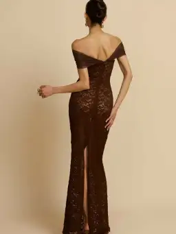 Meet Milana, a floor length silhouette crafted from vintage inspired chocolate lace. Designed with a romantic off-shoulder neckline in semi-sheer tulle, finished with delicate scalloped edges for a soft, feminine touch. Milana is perfect for golden hour sips and after dark moments. Pair her back with a statement stud and your favourite pumps for an elevated look.Please note that due to the delicate nature of the lace fabric, we kindly ask that you take extra care to avoid any snagging. Chains from handbags and certain types of jewellery can easily catch on the fabric, so we recommend wearing with care xxSize Small - Fits a 6 and Standard 8
