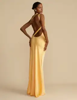 A floor-length gown designed for modern elegance. Crafted in a luxurious rich yellow hue cut on the bias. She features an asymmetrical one-shoulder design with a striking open back. Finely finished with crossover detailing and sculpted to embrace the feminine form.