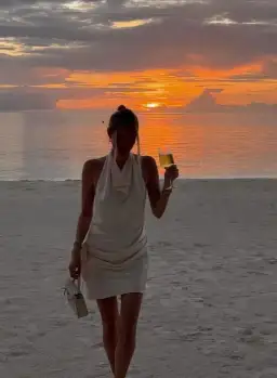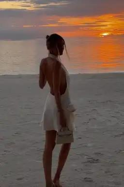 a flirty statement crafted in a soft ivory. Detailed with a plunging open back and full cowl neckline, intricately secured by a button closure. Designed for effortless elegance, Rosa features intricate ruching at the hips to embrace the feminine curves. Adding a playful and stylish finish, a hand-tacked silk touch rose sits gracefully on the side. For finishing touches, pair her with a neutral pump, and some classic gold jewels. Rosa is a sensual mini made for everlasting cocktail hours.