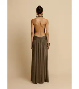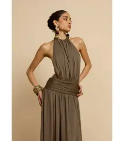 Introducing Santina, a draped silhouette crafted for ease and versatility. Made from a slinky khaki drape, she features a timeless halter neckline and a low-set waistband to anchor. The dress softly drapes over the body with gentle gathers, finishing effortlessly floor-length. Complete with a sensual open back and a ruched centre detail, Santina is made for warm nights and confident moments.