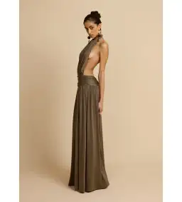 Introducing Santina, a draped silhouette crafted for ease and versatility. Made from a slinky khaki drape, she features a timeless halter neckline and a low-set waistband to anchor. The dress softly drapes over the body with gentle gathers, finishing effortlessly floor-length. Complete with a sensual open back and a ruched centre detail, Santina is made for warm nights and confident moments.