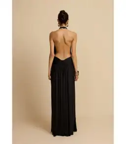 Meet Santina — a vision of understated allure. Crafted from a fluid black drape fabric, this halter-neck silhouette skims the body with soft gathers and a low waistband that flatters the feminine form. The open back and subtle ruched detailing add quiet drama, making it perfect for elegant evenings and sunlit celebrations alike.