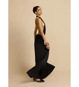 Meet Santina, a quietly confident silhouette designed for ease and versatility. Crafted from a slinky black drape fabric, she features a timeless halter neckline and is anchored by a low set waistband that subtly shapes the feminine form. The dress gently drapes over the body with soft gathers, finishing effortlessly at floor length. A sensual open back balanced by an understated ruched centre detail seamlessly completes the dress. Ideal for black-tie occasions and sunlit soirees, Santina moves with intention.