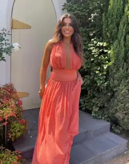 Introducing Serena, a striking fusion of femininity and elegance. Designed in a lustrous Coral hue, she radiates a warm and earthy charm. Serena features a flattering drop-waistband crafted from a quality viscose. Her graceful georgette drape cascades over the bust and flows from the hips.
