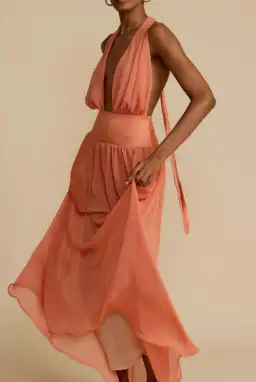 Introducing Serena, a striking fusion of femininity and elegance. Designed in a lustrous Coral hue, she radiates a warm and earthy charm. Serena features a flattering drop-waistband crafted from a quality viscose. Her graceful georgette drape cascades over the bust and flows from the hips.