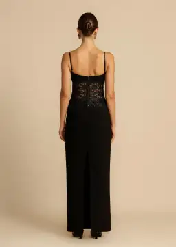 Crafted with a striking lurex lace contrasted with a luxe double crepe, embodying elegance with an edge. Padded cups provide the bust with lift and support, beautifully framed by a flattering sweetheart neckline. Embellished with raw floral edges for an understated touch of refinement.