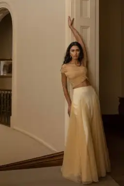 Elevate your look with our Violetta top, crafted with soft bridal tulle featuring a semi-sheer finish for a touch of sensual elegance. Made to drape over your bust and effortlessly sit off the shoulder to highlight your décolletage. Violetta features a hand tacked ruching technique that finishes at the waist. Paired perfectly with our Violetta Skirt for an elevated ensemble, or pulled back with your favourite denim. Offering styling versatility, the Violetta Top is a timelessness must have.