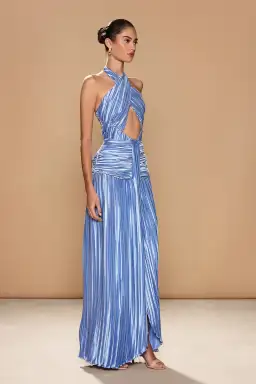 The Ariana Dress is a striking blend of elegance and allure, featuring a pleated, flowing silhouette with a captivating halter neckline. The intricately ruched bodice and daring cut-out details create a bold yet sophisticated look, while the slit adds a touch of drama for a striking, sophisticated finish.