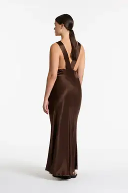 A Chocolate cut out maxi dress featuring contrast floral lace cut-out detail through front to accentuate the waist. Bias cut silk satin softly skims the body.