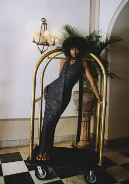 The Jennifer Dress in Charcoal Sequin by ASTA RESORT. An ankle-length, cold-shoulder dress with an elegant neck design and attached swing scarf. Close fitting with a mid-height leg split.