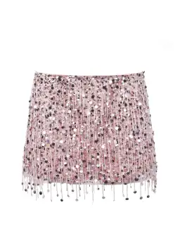 A myriad of sparkling sequins and cascading beads take flight off a base of silk linen. The skirt features a side zip closure and fitted waistline.