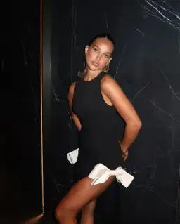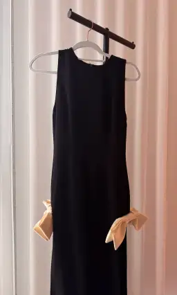A simple silhouette is made contemporary through exaggerated high cut away hips and large bow applique in a contrast satin fabrication