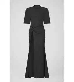 The Raya Maxi has arrived in a sartorial black colour way. This style features a dramatic floor length hem and oversized shoulder pads. An exaggerated split hem opens up to the top of the thigh where a knot detail is placed for a comfortable and flattering wear. Styled down with a pair of flats or elevated with a heel, the Raya is a versatile and timeless statement piece.