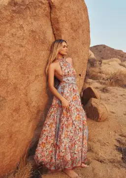 Brand new with tags- Summer 2022 Collection, Love Lost. A Ramie long gown featuring a high neck tie with a flattering open back also with a tie to pull in your elasticated waist with a long flattering circle draped skirt