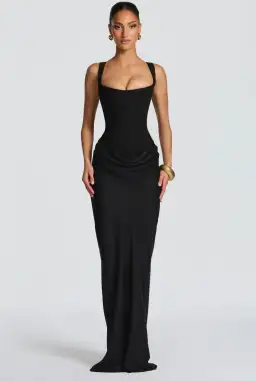 The Cornelia Maxi Dress showcases refined tailoring with a structured crepe bodice, dropped waist, and flowing lyocell skirt. Satin cowl overlay with deep pleats adds movement, while the lace-up back ensures a customized fit. Square neckline and tapered straps complete this sophisticated silhouette.
