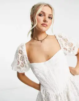 Features starburst daisy motifs rendered in delicate broderie to evoke a sense of carefree summertime freedom. The silhouette blends the old-world Edwardian romance of a corset bodice with the modern sensuality of a mini hem. The gathering along the asymmetrical bodice creates a full skirt that is destined for dancing.