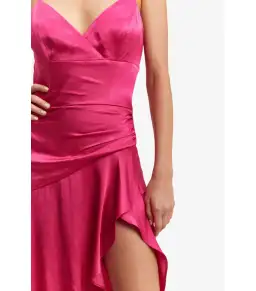 Plenty of drama, but the good kind. The Sorella Midi Dress exudes sensuality with its provocative thigh-high split, fitted silhouette, and silk-inspired fabrication. The magenta hue and ripple effect on the skirt add dramatic detail. An event staple.