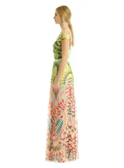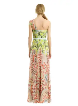 One shoulder or can be worn strapless. Full Skirt with a hidden back zipper. Printed lurex chiffon (100% Silk).