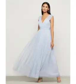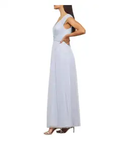 This dress is a floor-length evening gown in a soft, shimmering light blue-silver hue. It features a deep V-neckline with wide, pleated shoulder straps that extend into a structured bodice. The waistline is accentuated with a wide, ruched waistband that creates a flattering silhouette. The A-line skirt flows gracefully to the floor, designed with delicate pleating that adds texture and movement. The fabric has a subtle metallic sheen, giving the dress an elegant, ethereal look—perfect for formal occasions, weddings, or evening events.