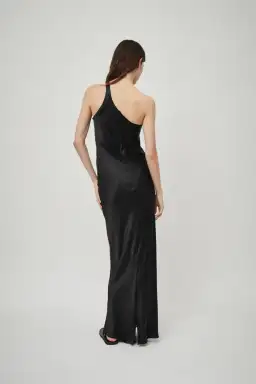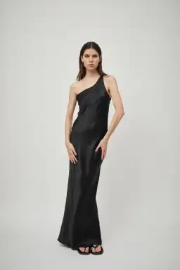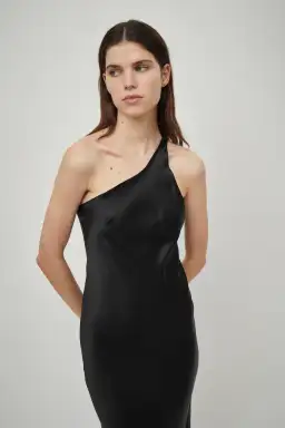 The One Shoulder Tank Dress in Black is a bias-cut silk satin tank dress with an asymmetric neckline and slim-line silhouette. Details an invisible zip closure and split hem.