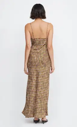 Cut on the bias from a signature geo print silk fabric, the Amber V Maxi Dress features underbust seams with light gathering, non-adjustable rouleau straps and a low-cut back.