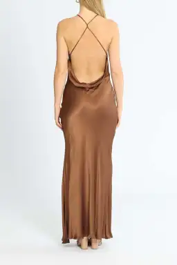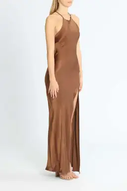 Embrace elegance in the Annika Maxi Dress in Brown by Bec and Bridge. This sleeveless dress boasts a chic open cowl back, a halterneck with crossover spaghetti straps, and a flattering thigh-high split. It's a captivating choice for your upcoming formal event, combining edge with sophistication.