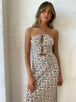 Cut from a signature floral print silk fabric, the Copper Field Maxi Dress is a strappy maxi length style with a halter neckline and ruched bust with cut out details. The maxi dress features a low scoop back with a crossover self-tie rouleau straps.