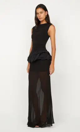 Ida Bubble Maxi Dress in Black. A captivating black maxi dress with a unique bubble panel at the hips. The perfect wedding guest dress for formal evening and special occasions.
