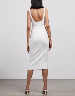 Cut from a stretch bonded crepe, the Karina Tuck Midi Dress hugs the body and cinches in the waist. The midi dress features a flattering square neckline and thin straps, complemented by side-tuck detailing.
