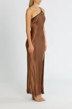 Get ready to steal the spotlight in the stunning Kehlani Maxi Dress in Chocolate from Bec and Bridge. This dress features a captivating asymmetrical one-shoulder design, cut on the bias, and adorned with contrasting rouleau straps. It also boasts a teardrop cutout, an open back, and a front leg split. Rent this dress today for a showstopping formal look that'll make you the belle of the ball.