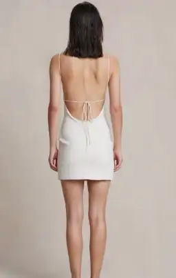 The Livania Mini Dress is a strappy form-fitted dress with a straight neckline, side bust darts and a statement open back with a self tie feature.