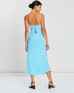 Bias cut midi dress with under bust cut out detail thin rouleau straps in self cut out detail under bust and waist cut on bias for flattering fit midi length Designed + made in Australia.
